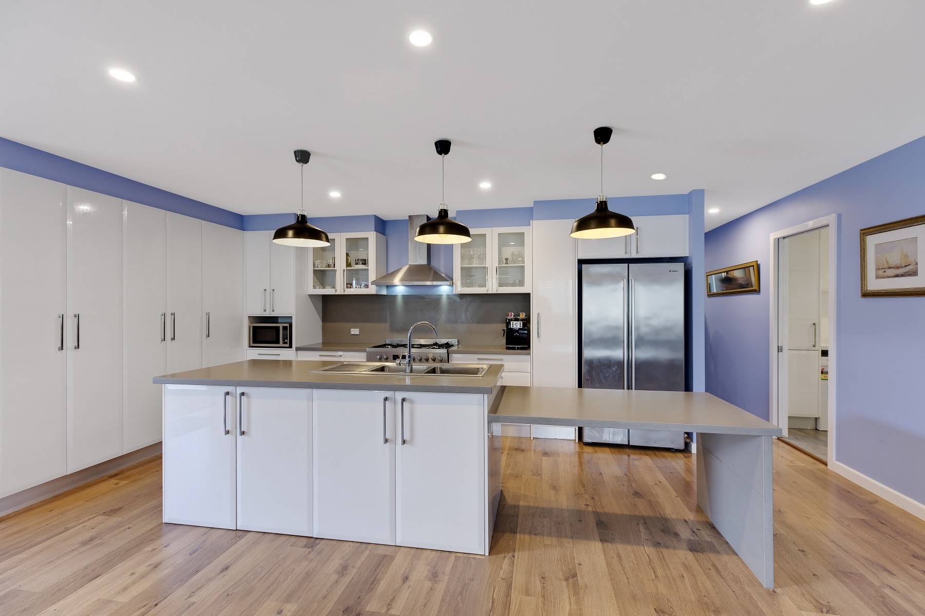 - Contemporary kitchen with extra wide oven and 5-burner gas cooktop, island bench, casual meals space, and loads of storage