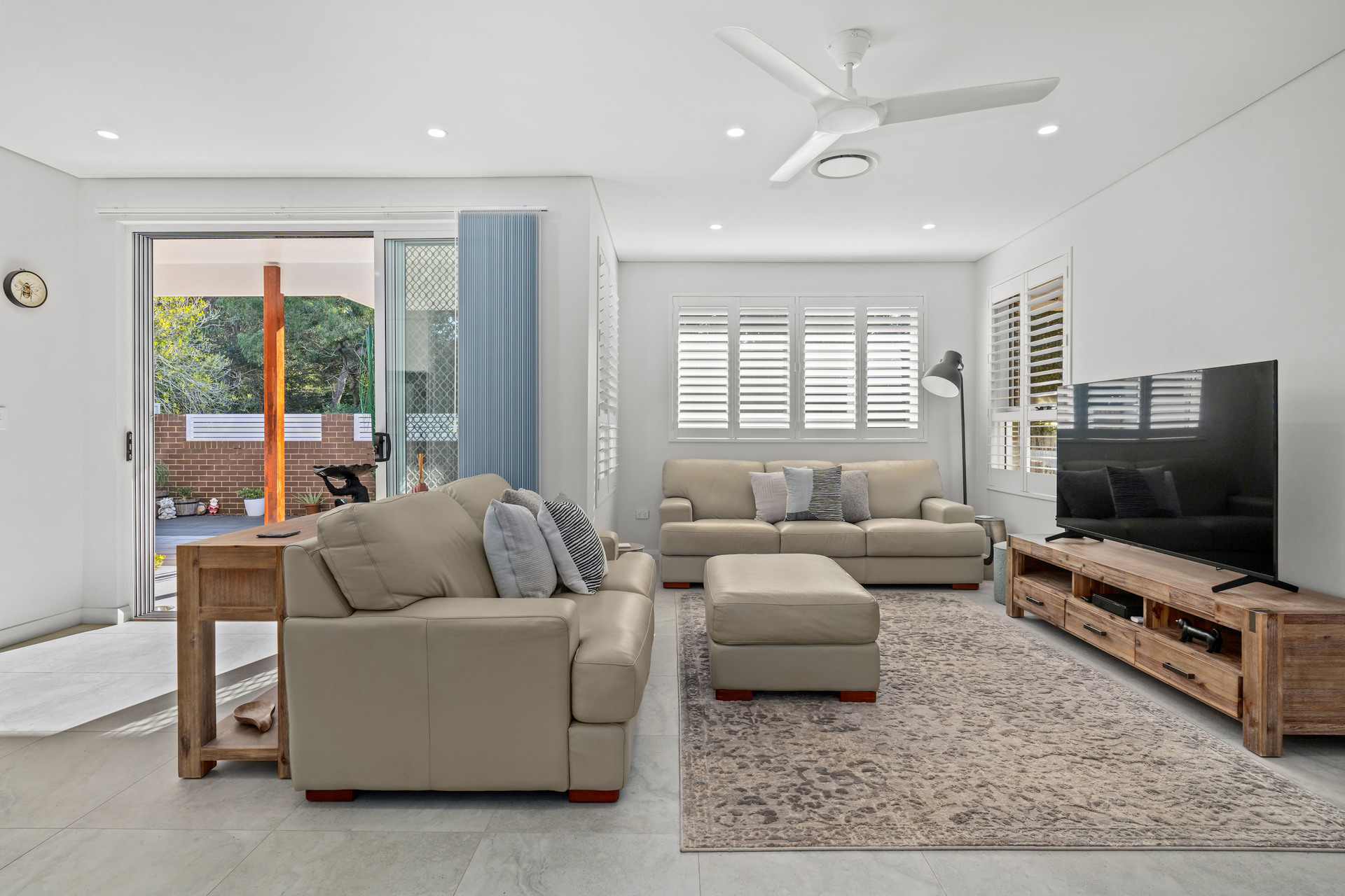 Features include: • Superb designer kitchen with 40mm Caesar stone bench tops, quality appliances, breakfast bar & ample cabinetry. Servery from the kitchen window onto the courtyard. • Tiled open plan living zone, bathed in natural light.